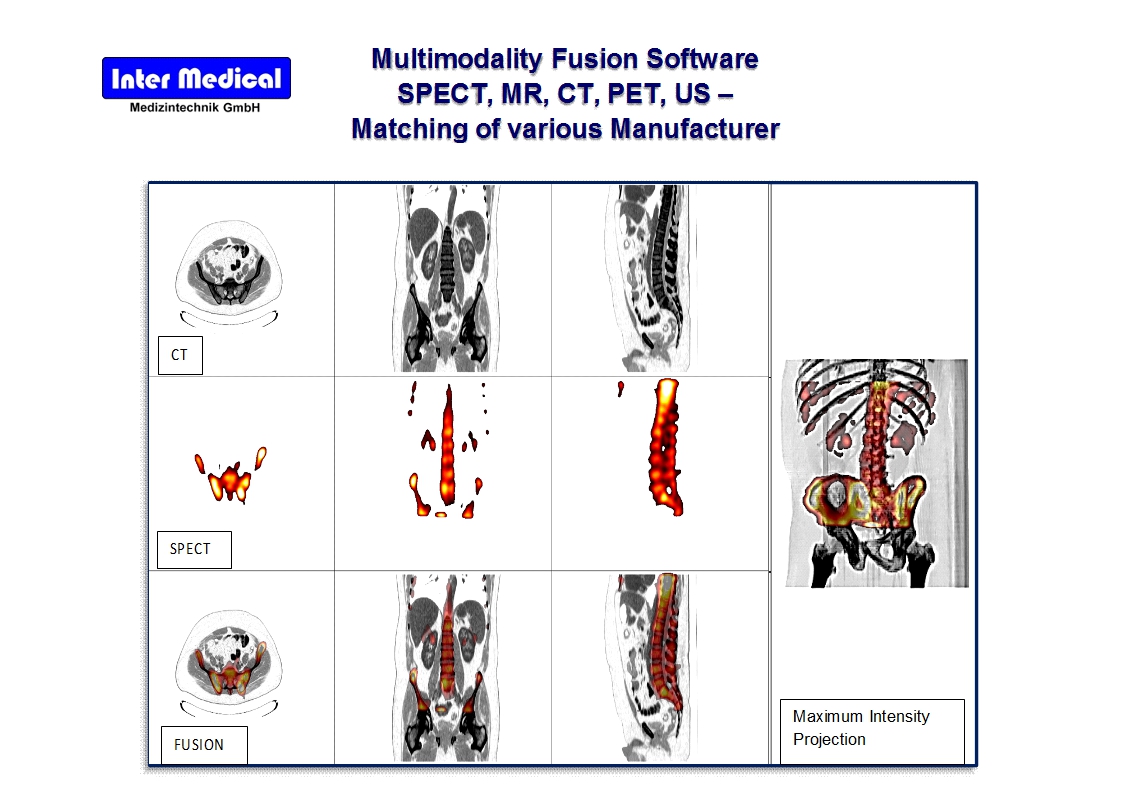 Multimodality Fusion Software für Daten von verschiedenen Hersteller (SPECT, MR, CT, PET, US) mit voller DICOM 3.0 Kompatibilität. Gerne stellen wir Ihnen die Software in einem kurzen Gespärch oder einer Videokonferenz vor. |