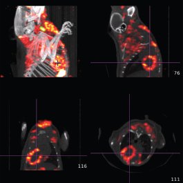 Das voll integrierte CT bietet niedrige Dosis mit Scanfunktionen (80 um und 160μm Pixelgröße) und Zykluszeiten von ~ 40-60 Sek. für eine Maus und 1-2 min. für eine Ratte. Das CT wird für die 3D-SPECT-oder PET-Field of View-Auswahl über eine patentierte einfache grafische Schnittstelle verwendet. Automatische, markierungsfreie Fusion von 3D SPECT- oder 3D-PET-Bilder mit 3D-Röntgen-CT-Bildern ist ein Standard-Feature bei U-SPECT-II / CT und Vektor / CT.