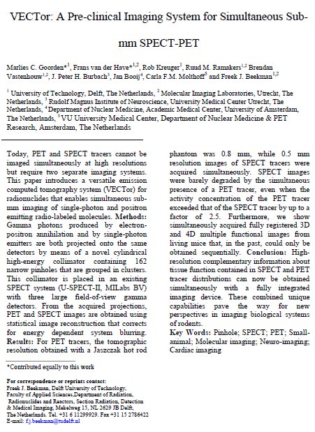 MILabs - VECTor Preclinical SPECT / PET system for preclinical research with simultaneous SPECT / PET uptake in the sub millimeter range. The patented special-pinhole collimator and the powerful PET / SPECT electronics makes the system a highlight that has no equal investigated. |